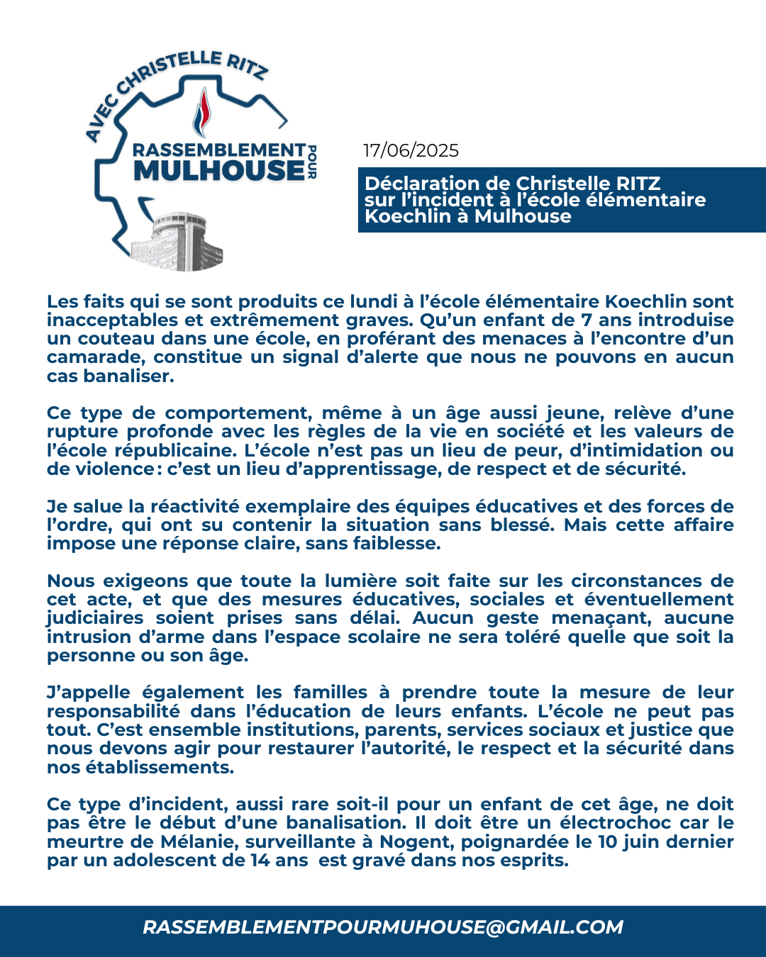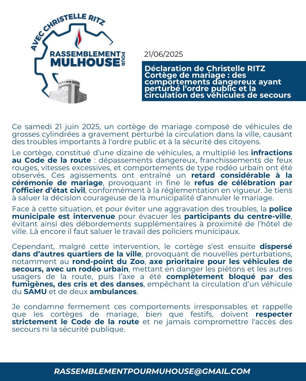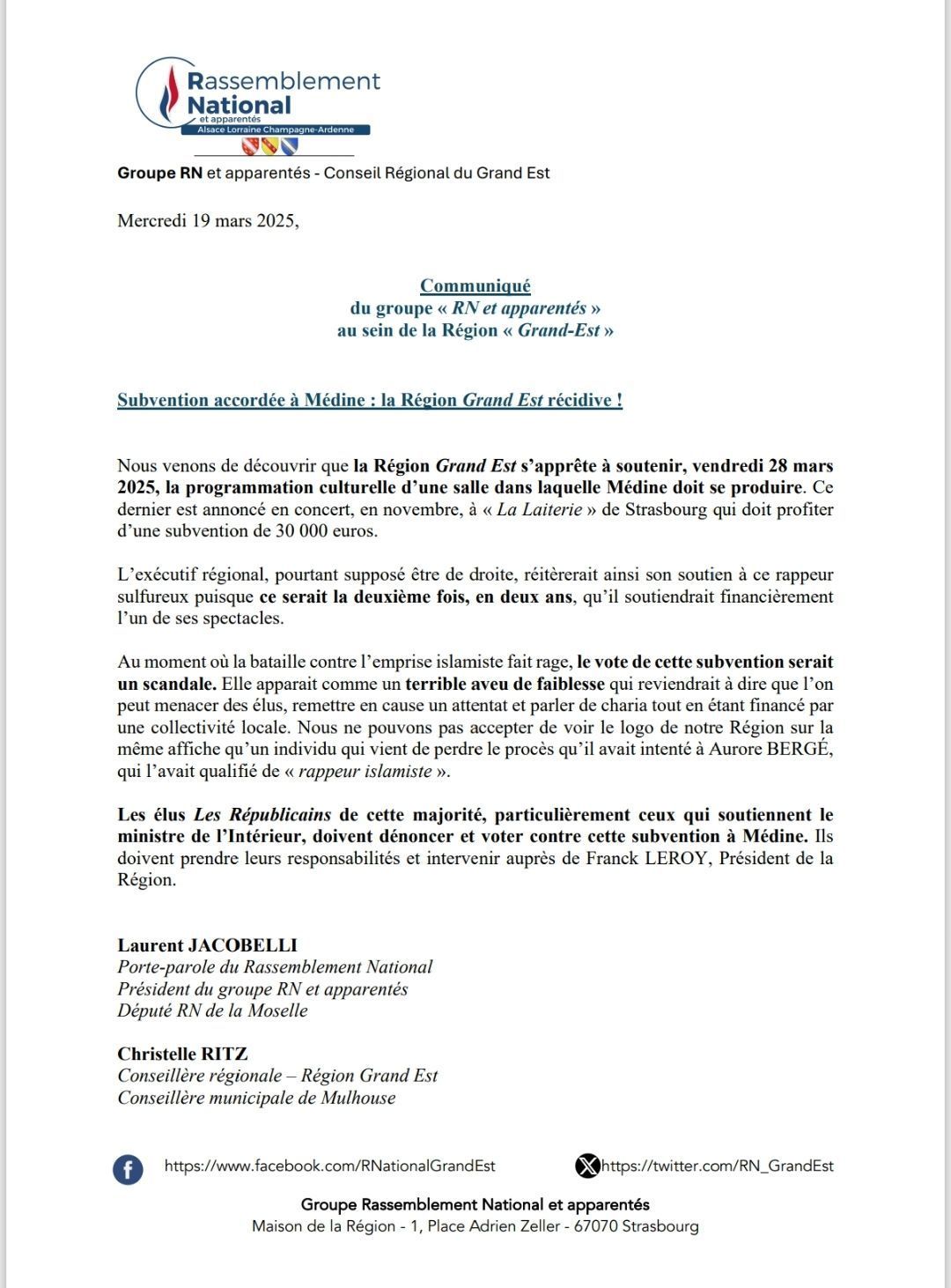 Performance à la HEAR : indignation partagée et incohérence politique La « performance artistique » organisée à la HEAR, mettant en scène la destruction symbolique d’un véhicule de police, est profondément choquante et inacceptable. Sous couvert de création, c’est un message de dénigrement et de banalisation de la violence envers les forces de l’ordre qui a été donné. Sur ce point, je rejoins pleinement la position ferme et responsable du Maire de Mulhouse : la liberté artistique ne saurait servir de prétexte à l’outrage, encore moins dans un établissement financé par l’argent public. En revanche, je m’étonne et m’inquiète du positionnement de l’adjoint au maire mulhousien Thierry Nicolas, par ailleurs élu à la Région, qui a choisi de voter avec la majorité régionale le maintien de la subvention de 25 000 euros à la HEAR. Ce vote interroge : comment dénoncer publiquement des faits aussi graves tout en continuant, dans le même temps, à les soutenir financièrement ? La cohérence politique exige des actes en accord avec les discours. À l’heure où chaque euro public doit être justifié, le maintien de cette subvention envoie un signal pour le moins contradictoire. Soutenir nos forces de l’ordre, c’est aussi refuser que l’argent public finance des initiatives qui les tournent en dérision ou les stigmatisent.